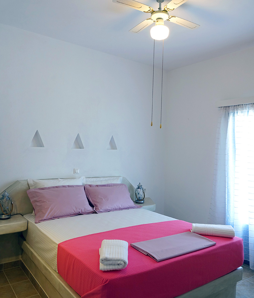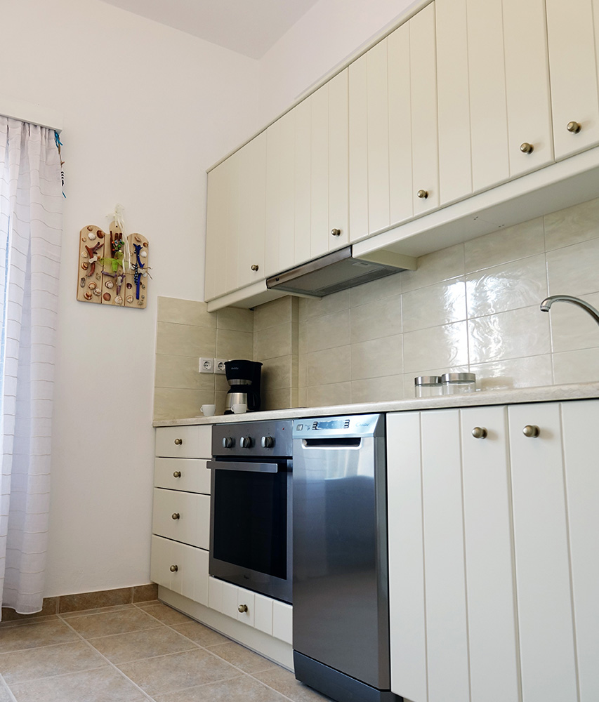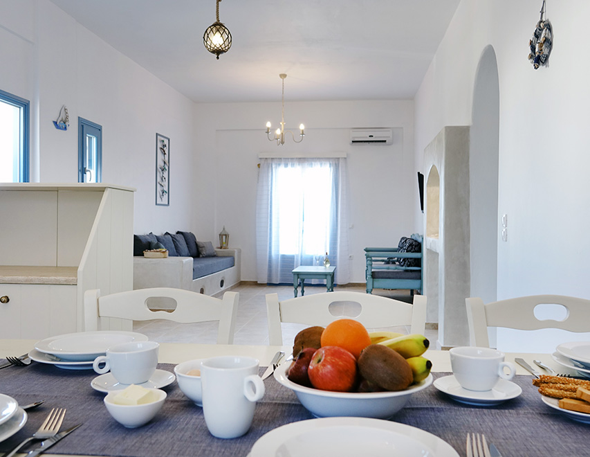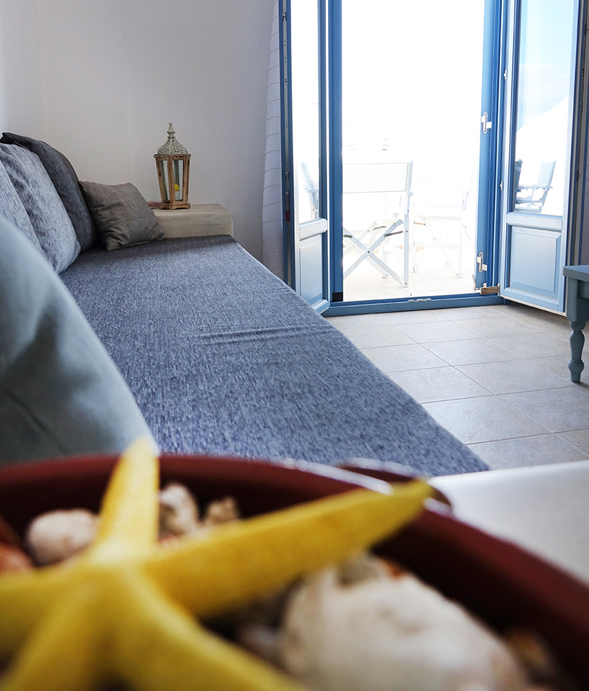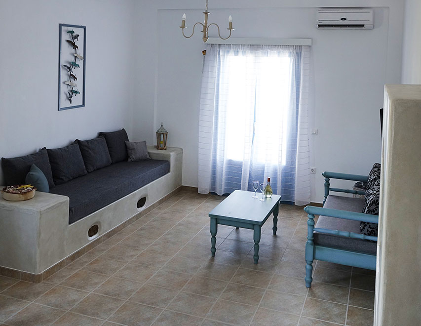 Bright white in all its grandeur, modern and cosy, JASMINE accommodates four, with the addition of two more. The interior smartly decorated to take advantage of every corner of the apartment. Bright colours in all the rooms, two bathrooms with traditional shower dividers, mounted cabinets and wall built couches, compatible with the local architecture, fully equipped kitchen, routine housekeeping, TV and Wi-Fi and the Aegean on your lap!