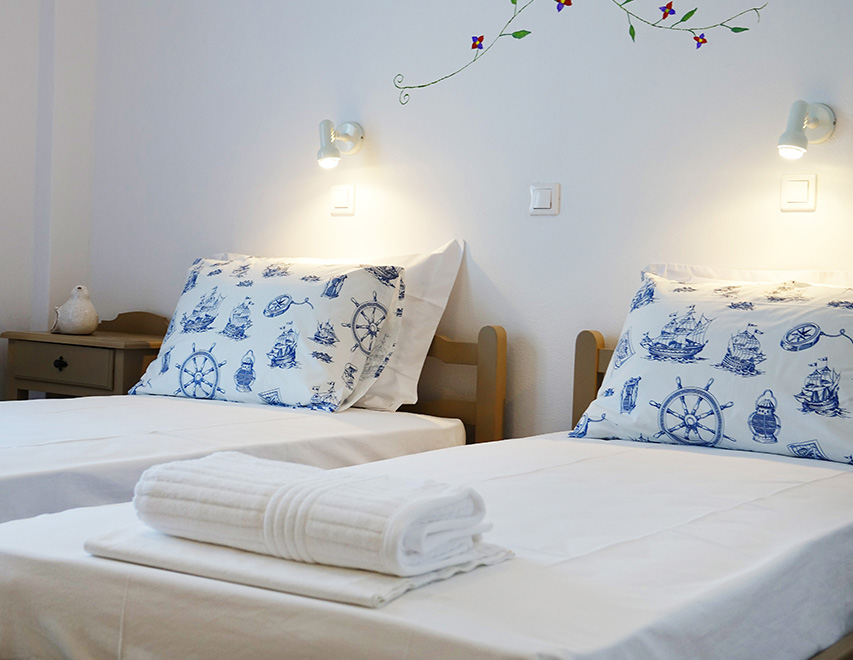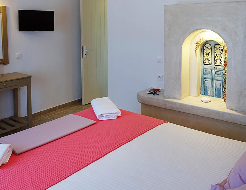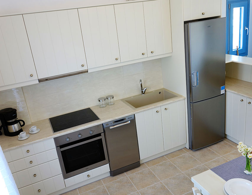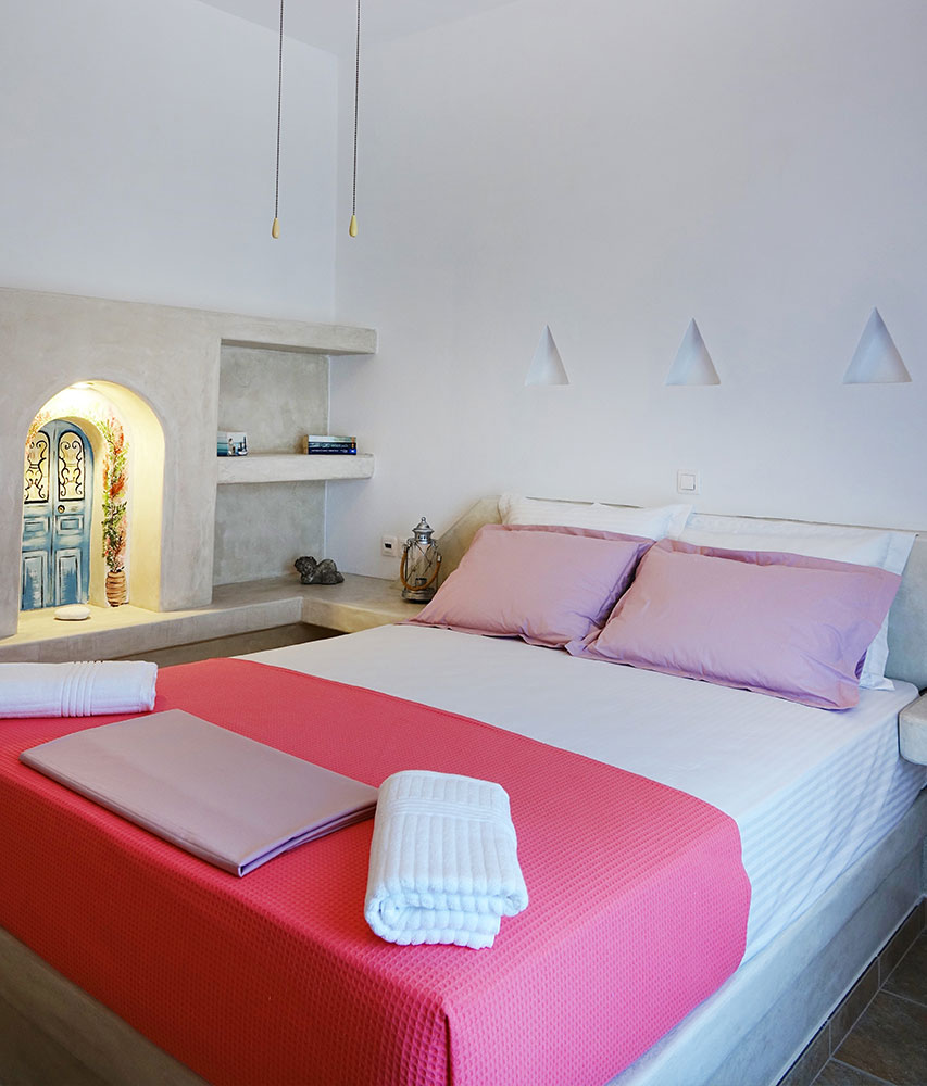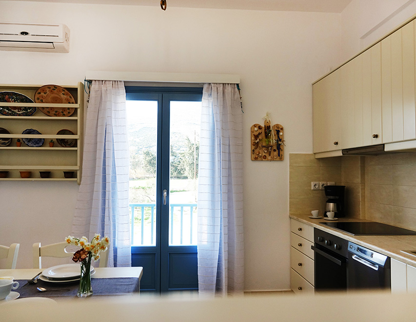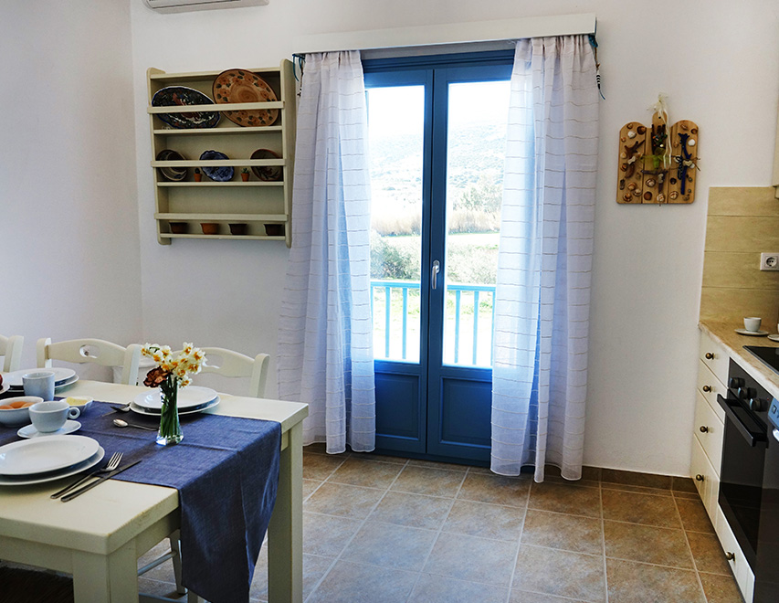 Bright white in all its grandeur, modern and cosy, JASMINE accommodates four, with the addition of two more. The interior smartly decorated to take advantage of every corner of the apartment. Bright colours in all the rooms, two bathrooms with traditional shower dividers, mounted cabinets and wall built couches, compatible with the local architecture, fully equipped kitchen, routine housekeeping, TV and Wi-Fi and the Aegean on your lap!